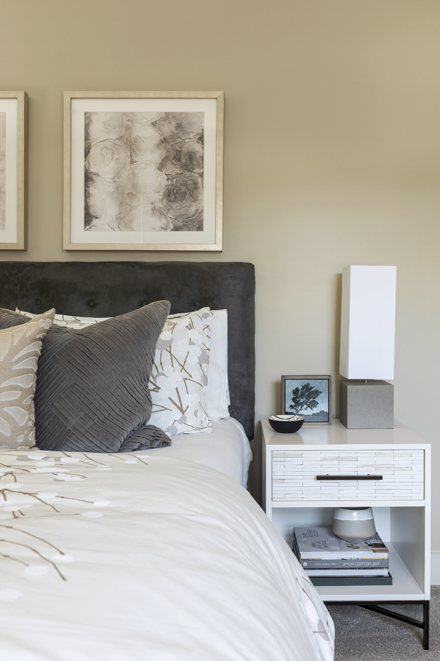 A light and soothing colorway washes this space, designed to function as a luxurious oasis for visiting family and friends. The king bed is accented with textiles and artwork that represent florals abstracted in a variety of artistic expressions. The walls gain slightly more warm color in this room, balancing the cool grey accents of the upholstered tufted headboard and bedding. The straight lines of the nightstands and concrete lamps give a modern edge to the overall softness and femininity of the space.