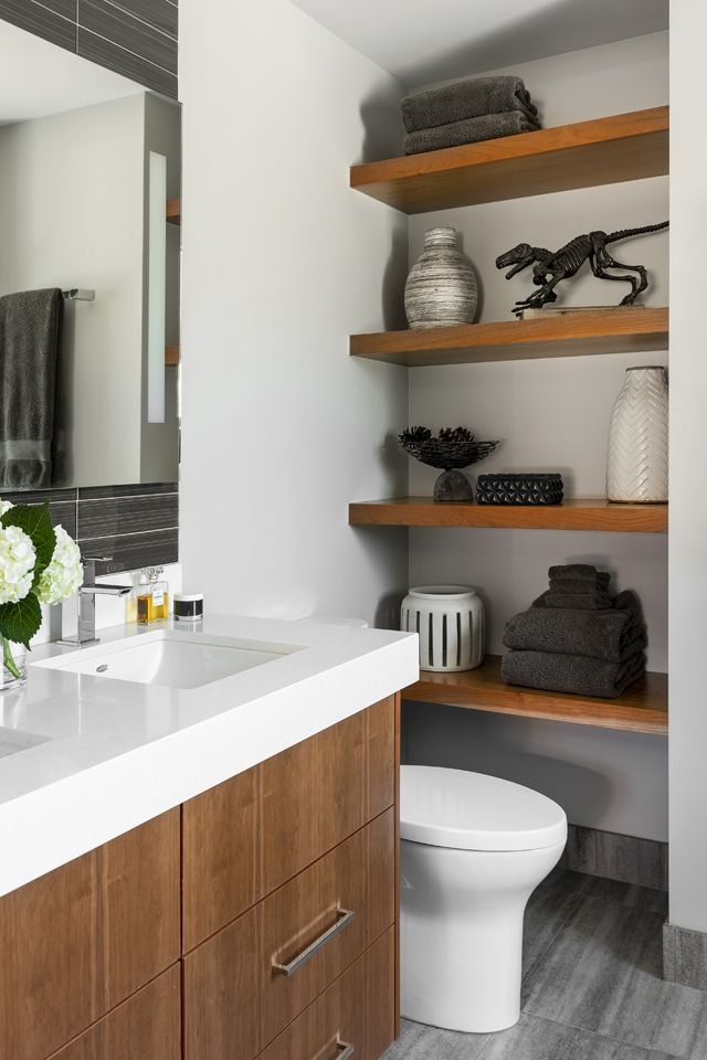 An unused nook in the master bath was transformed into useful and attractive floating shelves for both display and extra storage. The decorative objects add personality and contrast to the clean lines of the space. Both the charcoal-streaked porcelain floor tile and the blue-grey glass backsplash tile have the appearance of solid mountain rock. The cramped bathtub was removed and replaced with a large frameless glass shower enclosure that allows natural light to reach the vanity area. An extra-thick countertop gives added visual weight to the floating dual-sink vanity.
