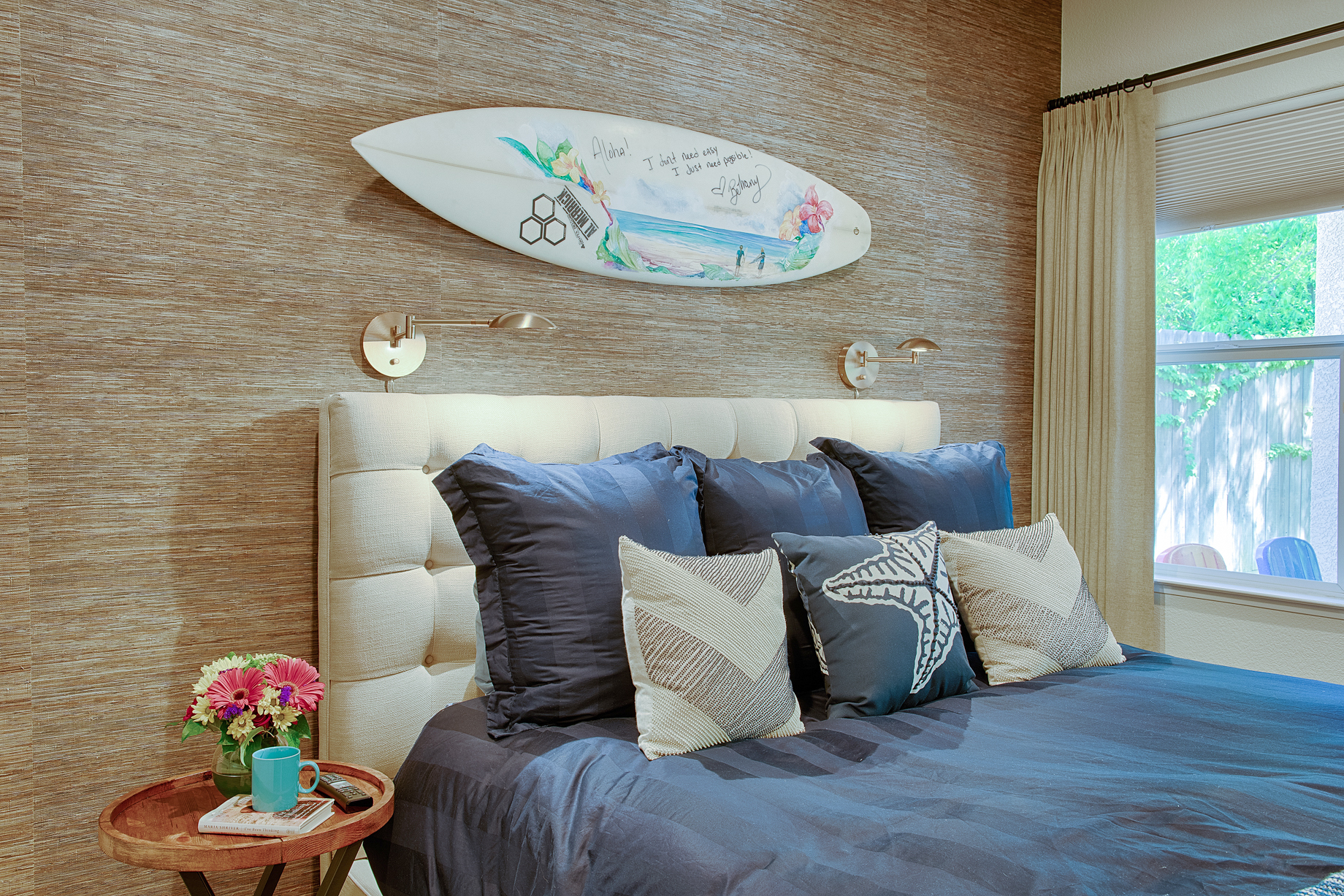 As an avid surfer, there was no better piece of art to adorn Julie's master bed than a Bethany Hamilton-signed surf board.